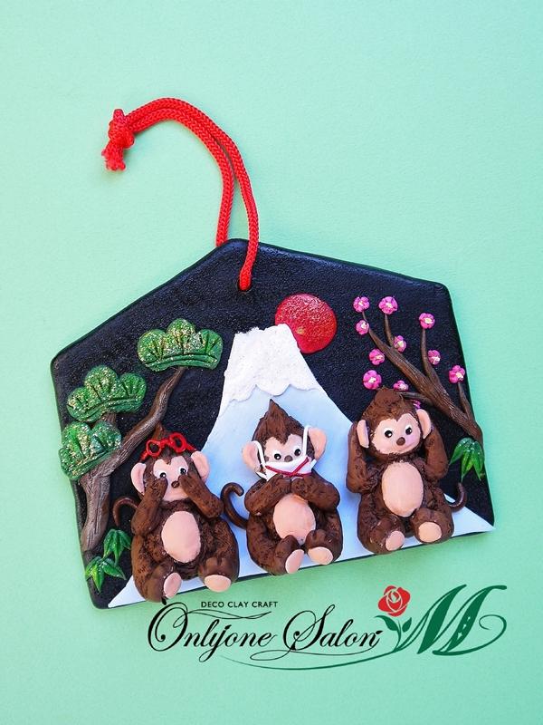 2016干支オリジナルpart2”絵馬風 天邪鬼モンチー”のご案内 2015/11/03 “Onlyone Salon M”では、お教室の生徒さん限定 “お正月オリジナルレッスン” を企画致しました。 先日ブログにアップさせて頂いた来年の干支お猿のモンチーが 絵馬風になりました~干支の天邪鬼モンチーです 見ざる言わざる聞かざるですが絶対見てる~マスクしていて言えない~ 絶対聞いてるモンチー お正月らしい富士山の初日の出や松竹梅も入れてみました